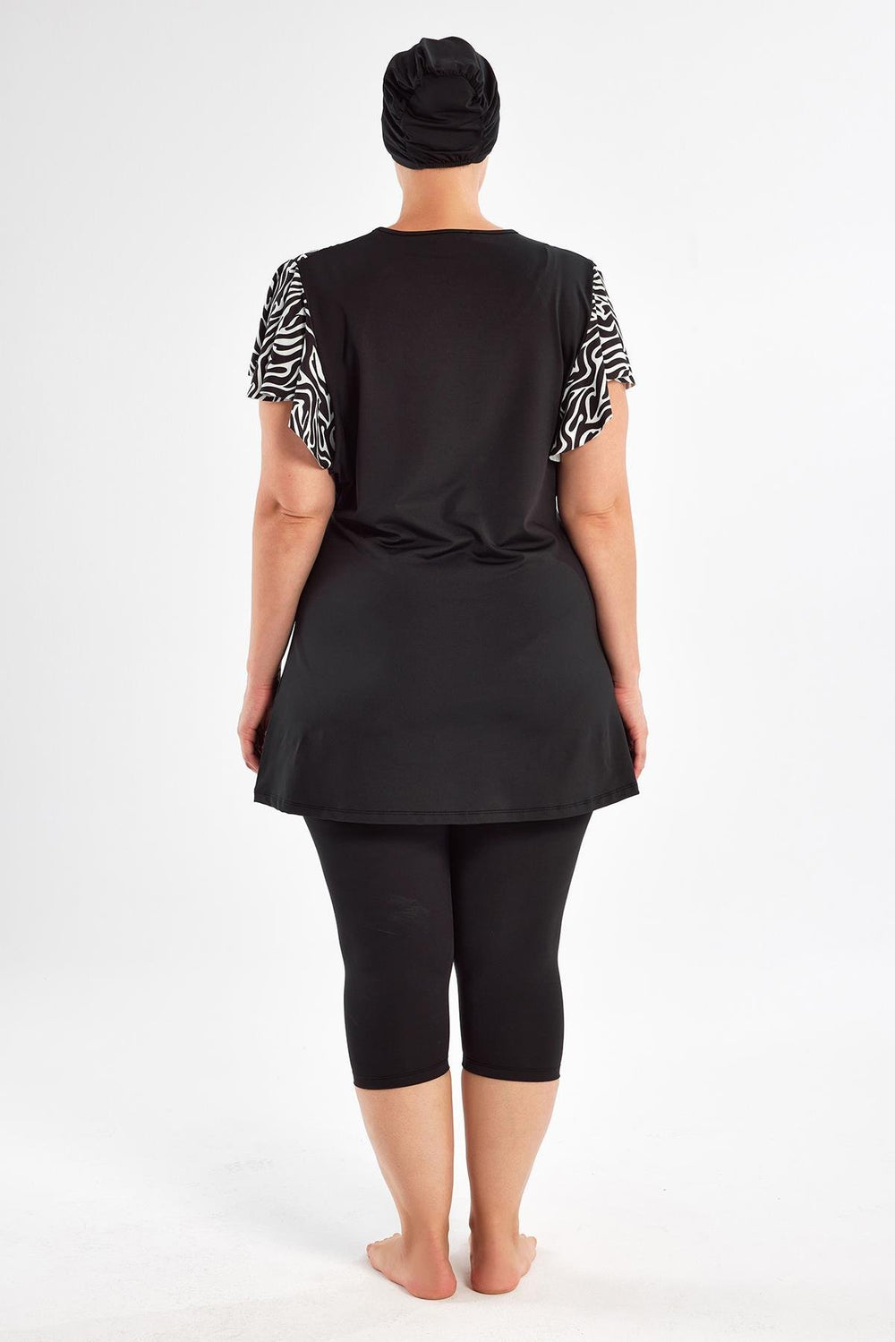 ملابس سباحة قصيرة الأكمام بتصميم محجبات ترتقي بأناقتكِ على الشاطئ إلى مستوى جديد، بتصميمها الأسود البسيط وتفاصيلها الأنيقة بنقشة حمار الوحش. قماشها المقاوم للماء وسريع الجفاف يبقيكِ جافة وخفيفة طوال اليوم، بينما يوفر تصميمها المرن حرية الحركة. تتميز هذه الملابس بتصميمها القصير الأكمام، وتوفر راحةً تناسب جميع المقاسات، مع إمكانية اختيار المقاس الكبير.