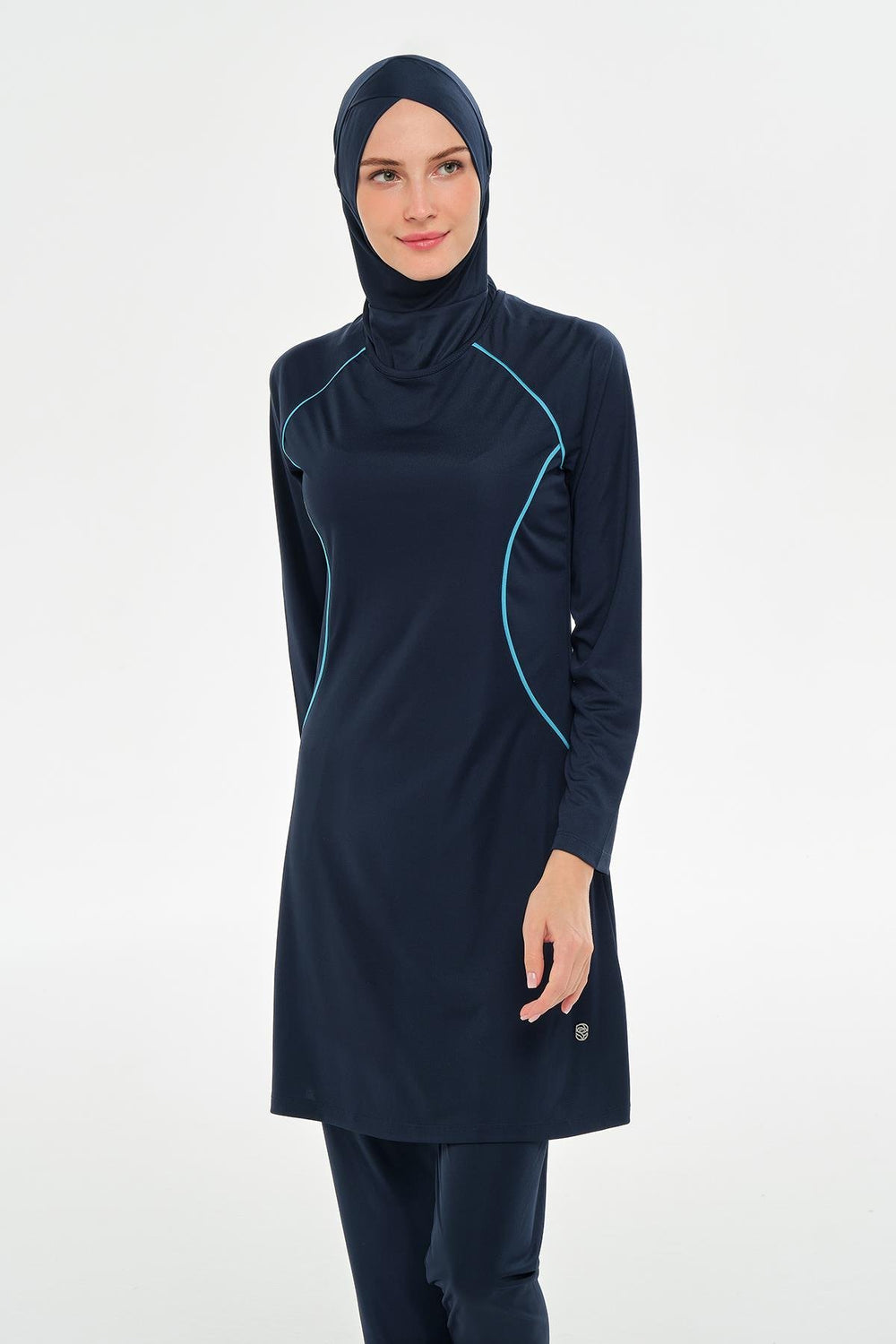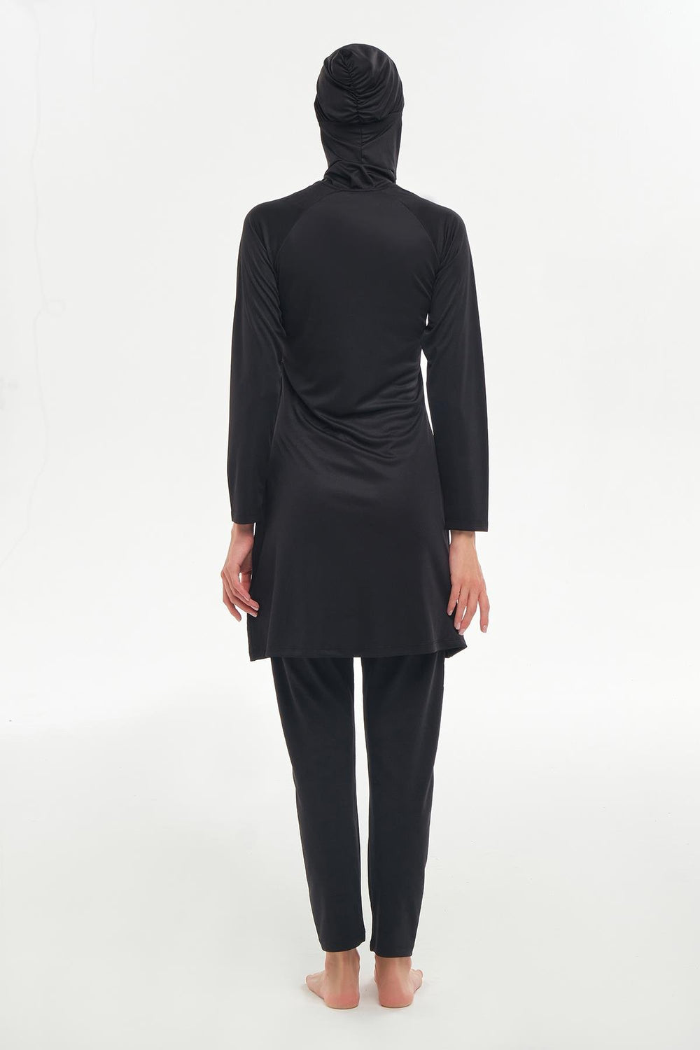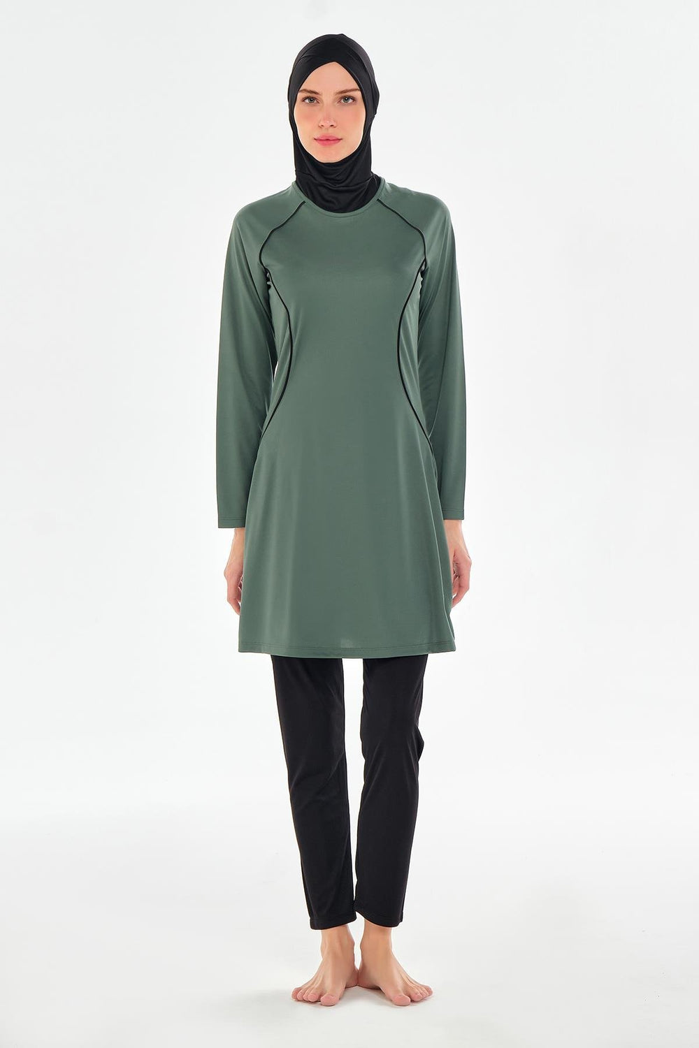 long-sleeved hijab swimsuit stands out with its simple and elegant design. Made of interlock fabric, this swimsuit provides a pleasant swimming experience by offering comfortable movement. Thanks to its fast-drying structure, it offers a practical use both on the beach and in the pool.