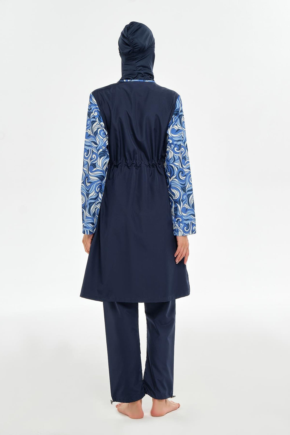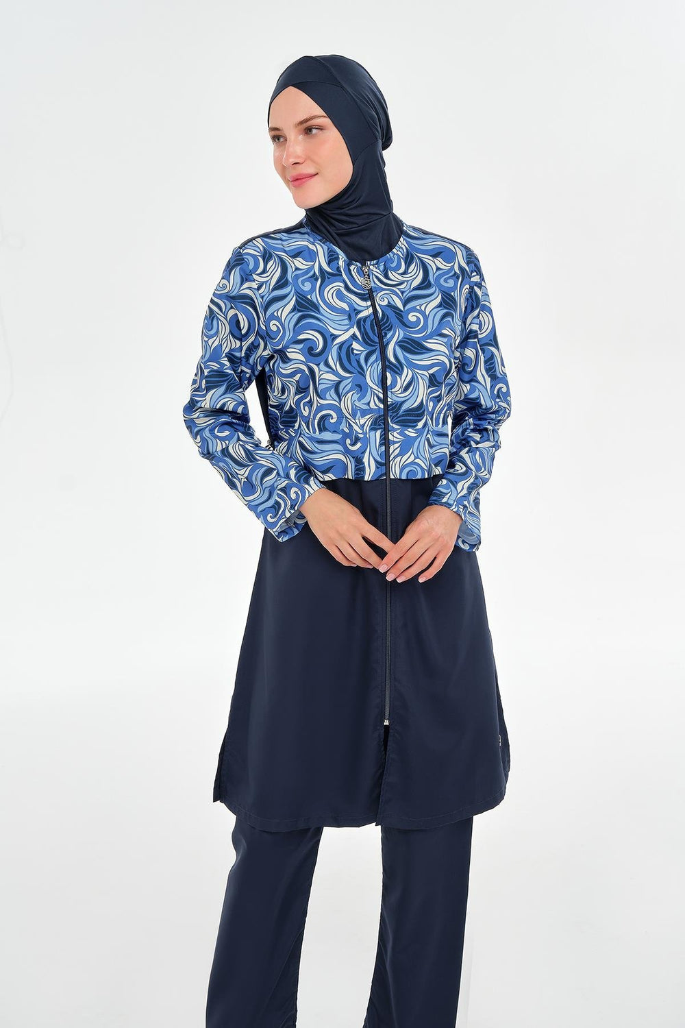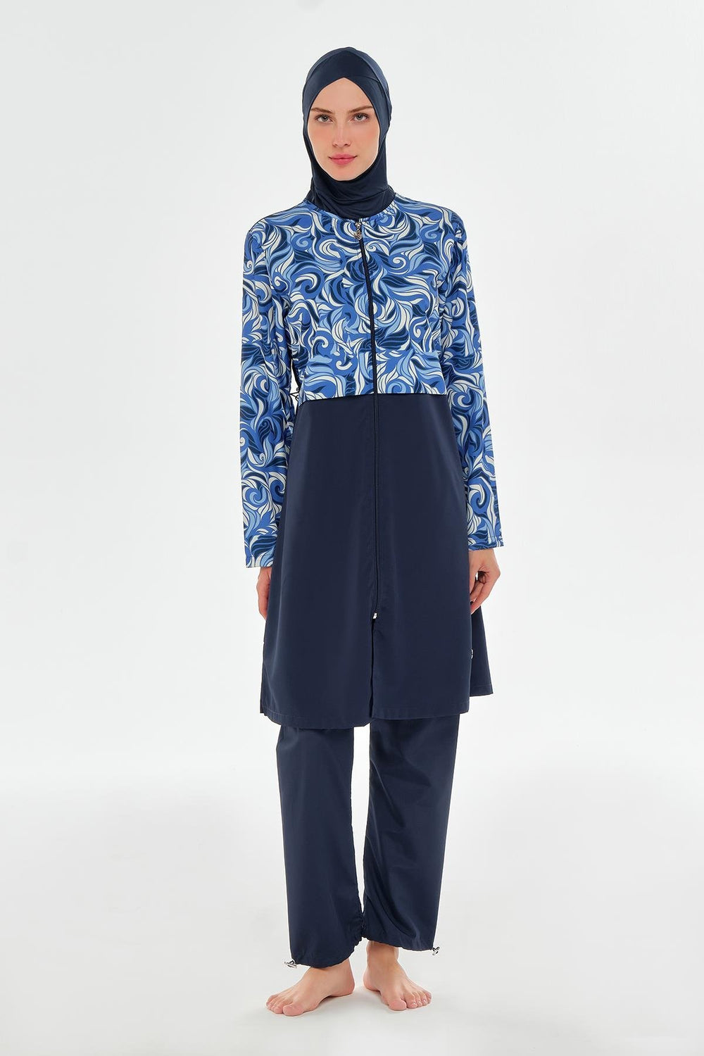 long-sleeved modest swimsuit offers a dynamic look with its striking patterns and vibrant colors. Its construction made of interlock fabric provides durability and comfort. With its fast-drying feature and modern design, you can take your beach and pool pleasure to the next level.